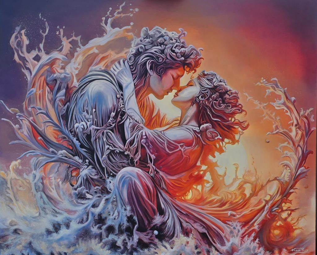 Their union bends the laws of nature: the sea begins to boil, fire flows like liquid, and the horizon burns with the glow of their passion. In this fusion of opposites, love becomes more than a feeling—it becomes creation. Two souls crash like waves, not to break, but to become something far greater.